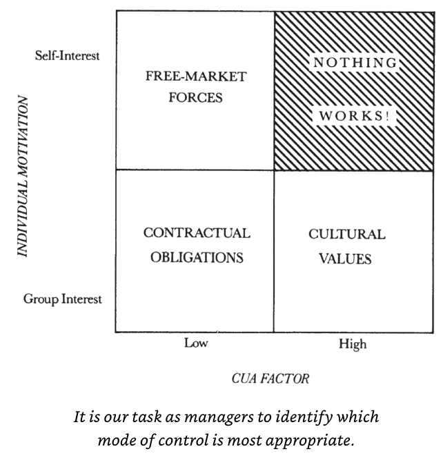 El modo adecuado de control depende de las motivaciones individuales (desde las egoístas hasta las grupales) y del factor CUA (el grado de complejidad, incertidumbre y ambigüedad) del entorno. Cuando las personas se interesan por el grupo, se pueden recurrir a obligaciones contractuales (como un contrato de trabajo) para las circunstancias de baja CUA, o a valores culturales para las de mayor CUA.