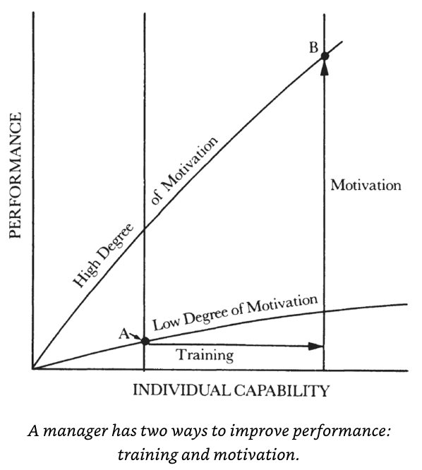 Para maximizar nuestro rendimiento, debemos encontrar maneras de mantener a nuestros subordinados en el máximo rendimiento. Esto puede lograrse mediante la capacitación (si la competencia es el factor clave) o la motivación. En este último caso, un gerente solo puede influir en el entorno que influye en la motivación.