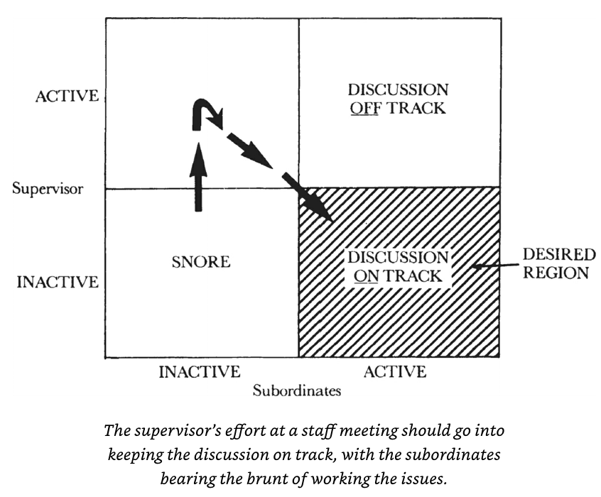 Reuniones de personal: reuniones regulares entre pares con el objetivo de que los subordinados asuman la mayor parte de la responsabilidad de resolver los problemas. El rol del supervisor es el de moderador y facilitador, manteniendo el rumbo. Procure que haya una conversación familiar en la mesa en lugar del “grupo de desconocidos” que se ve en las reuniones improvisadas (mirá más abajo).