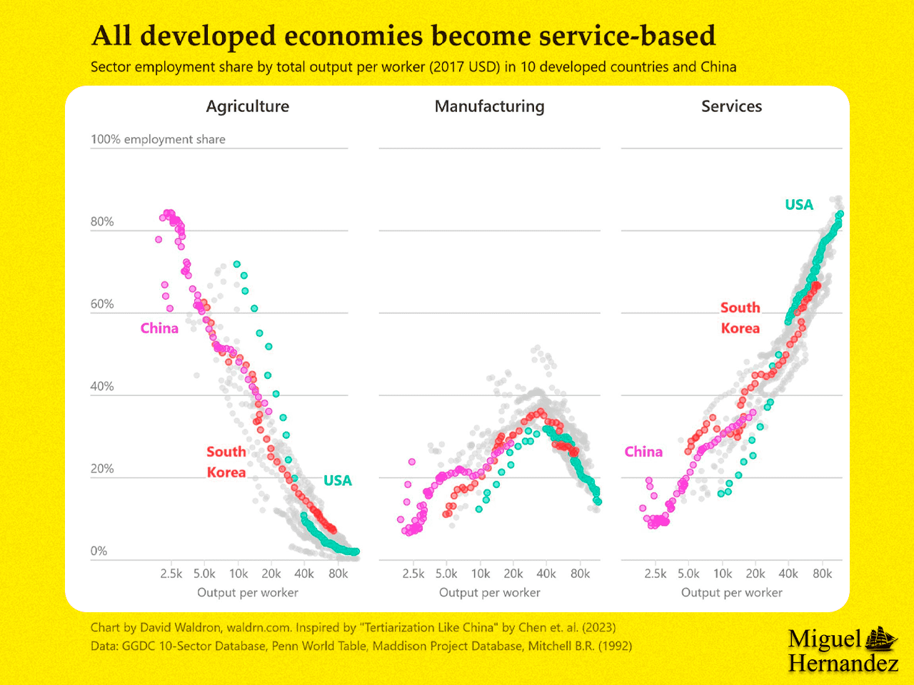 Los datos lo demuestran con claridad. En Estados Unidos, por ejemplo, el sector servicios representa más del 77% del PIB y emplea a más del 80% de la fuerza laboral. Corea del Sur ha seguido un camino similar, aunque con particularidades propias del modelo asiático de desarrollo. Incluso en China, un país tradicionalmente industrial, la proporción del empleo en servicios ha crecido significativamente en los últimos 20 años.