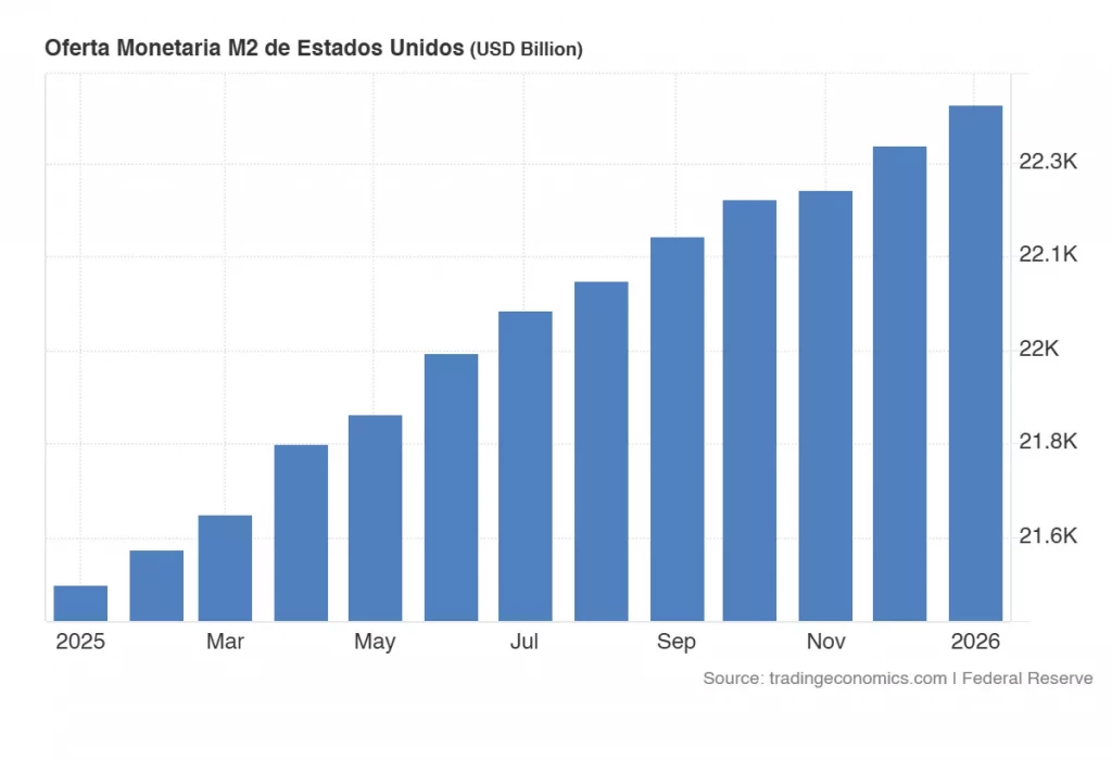 - Expansión monetaria en EE.UU.: La oferta monetaria M2 alcanzó $22,442 billones en enero 2026 (datos publicados el 24 de febrero), con un incremento de $75.9 billones desde diciembre 2025, alertando sobre presiones latentes que podrían amplificar distorsiones si no se corrigen.